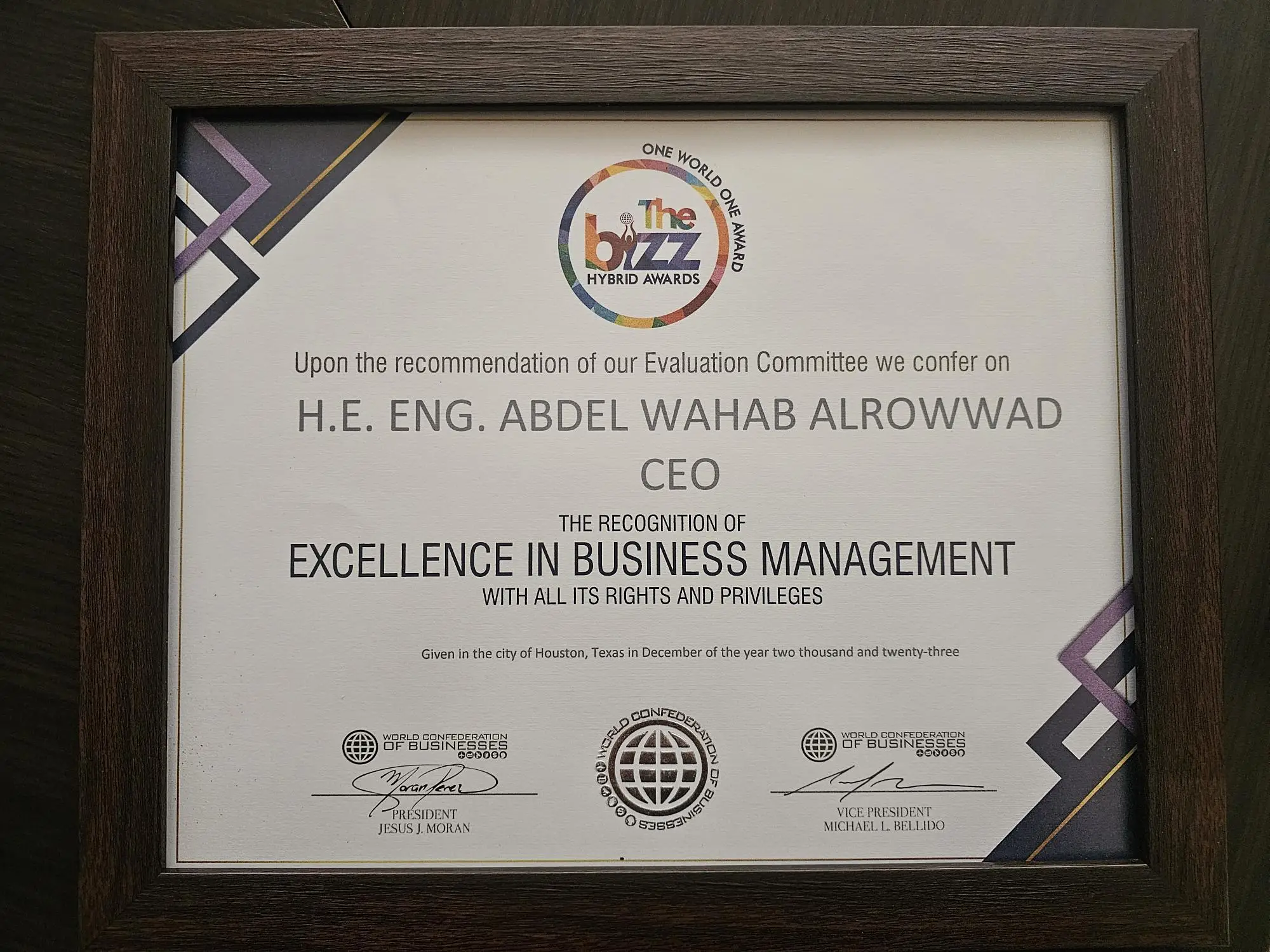 Excellence in Business Award from the World Confederation of Business (WORLDCOB)